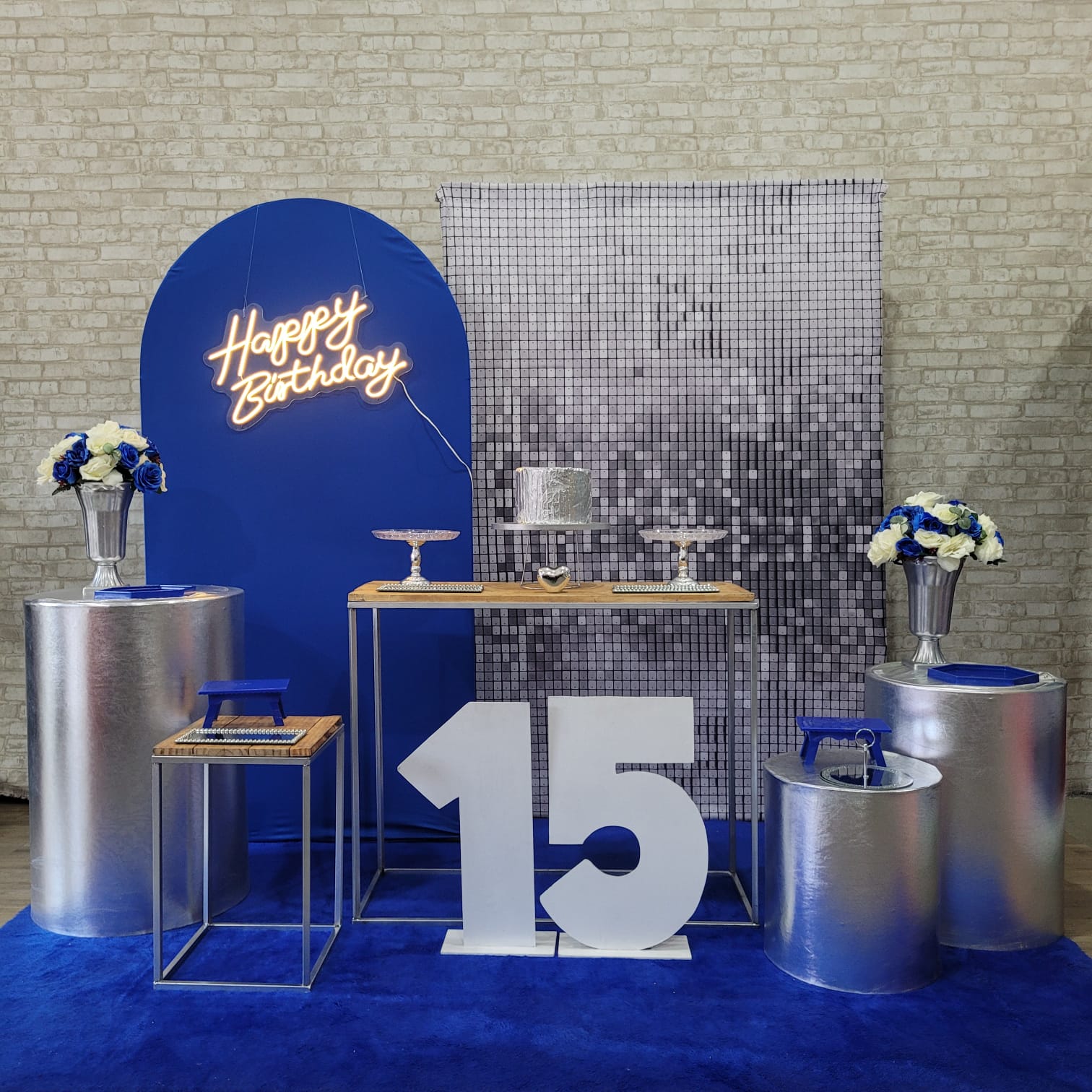 Alugue Tema Para Festa Decoração Azul com Prata Tecido ( Modelo 1 )