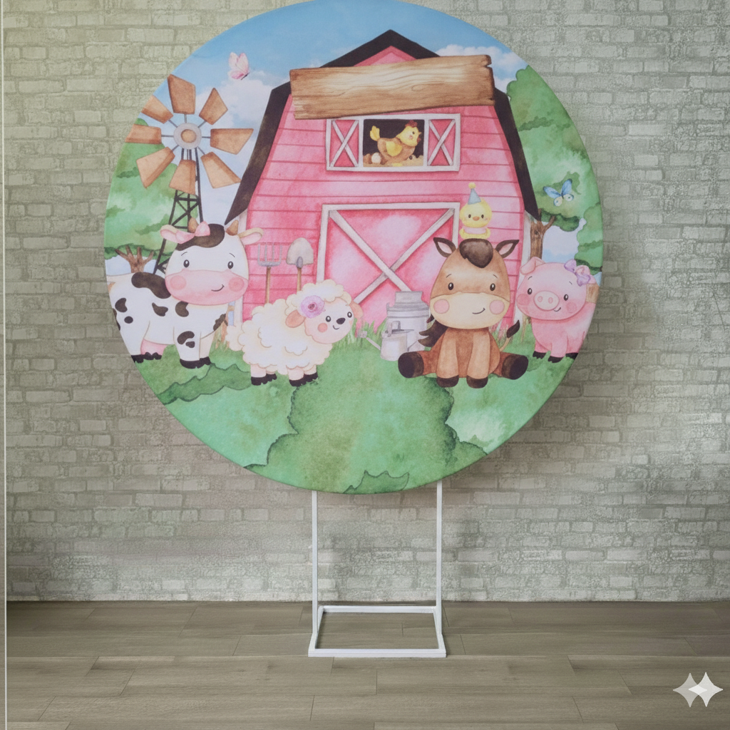 Alugue Estrutura Painel Redondo e a Capa de Tecido do Tema - Fazendinha Rosa