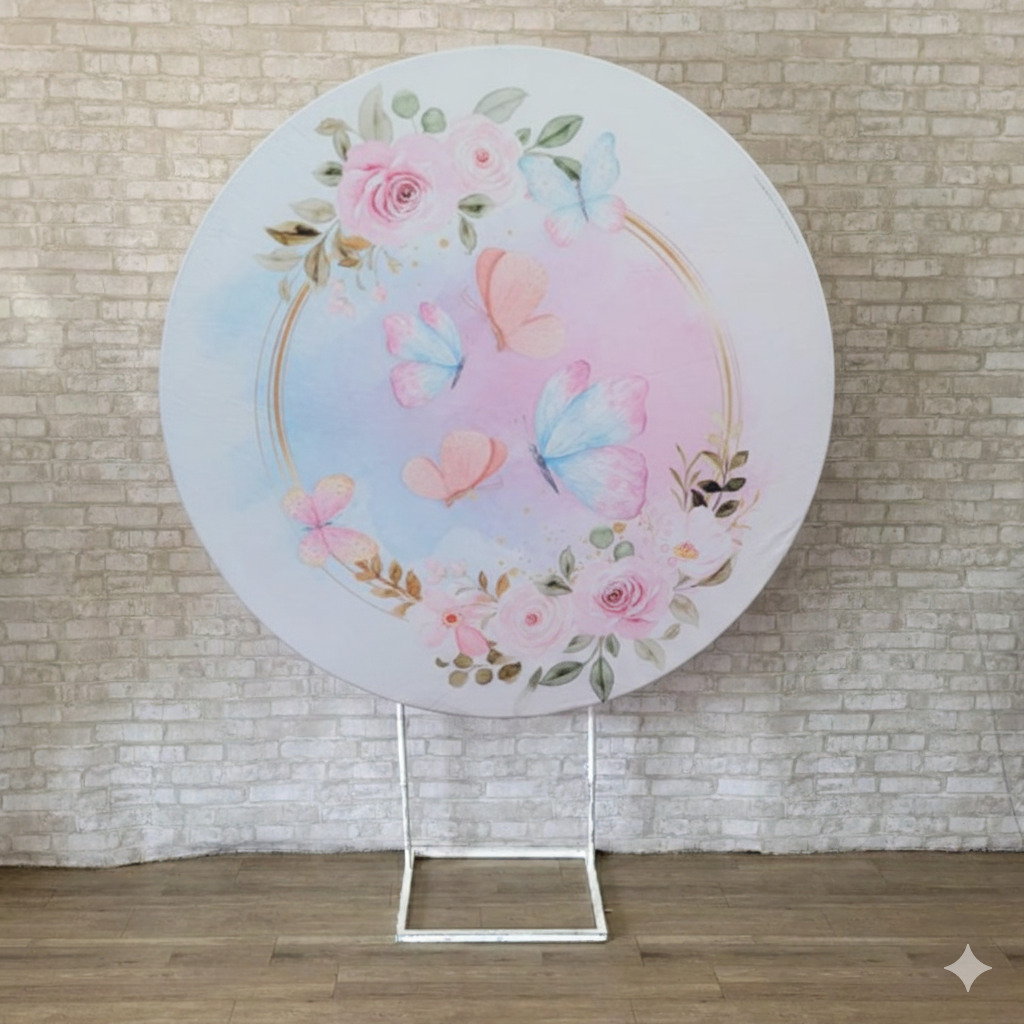 Alugue Estrutura Painel Redondo e a Capa de Tecido do Tema - Jardim das Borboletas