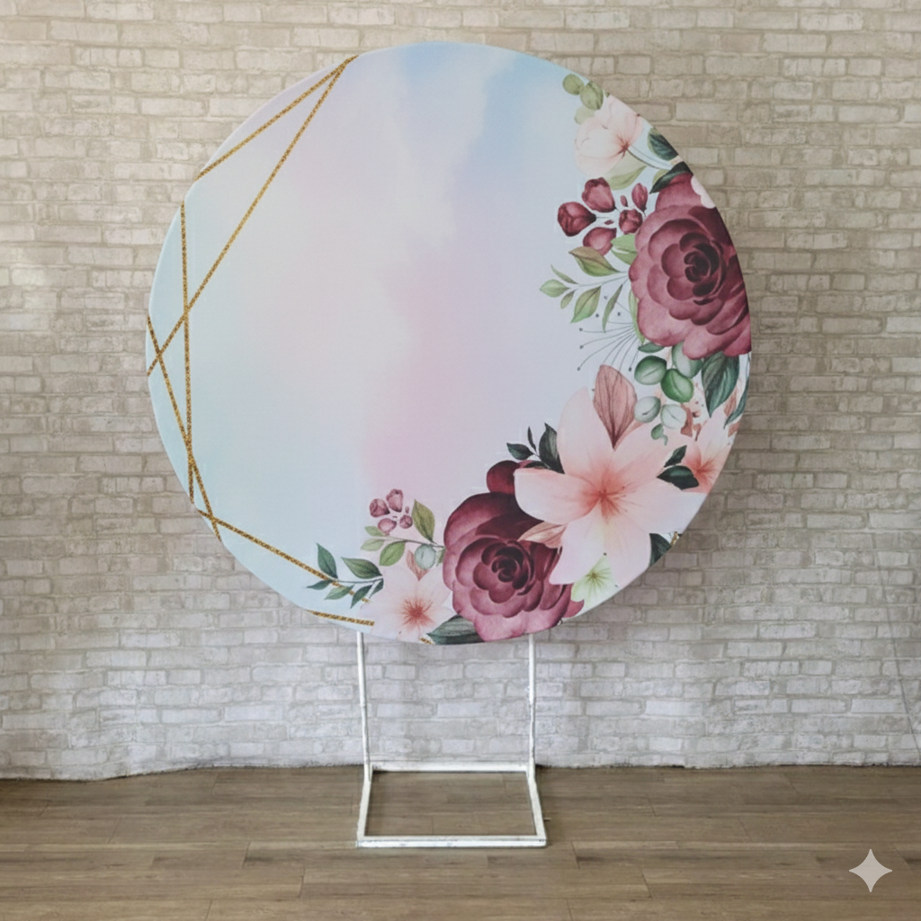 Alugue Estrutura Painel Redondo e a Capa do Tema Flores Vinho Tecido