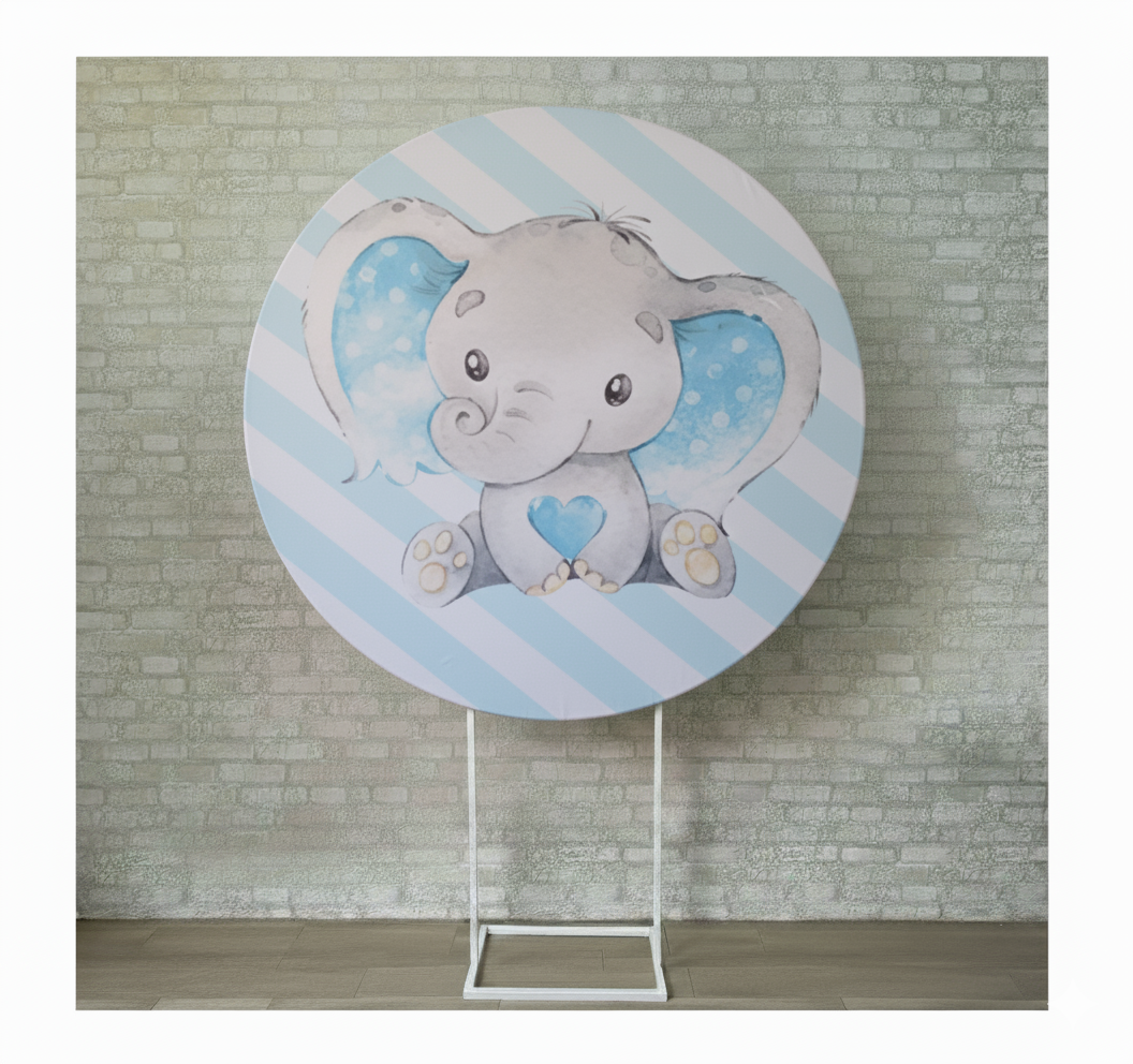 Alugue Estrutura Painel Redondo e a Capa de Tecido do Tema - Elefantinho Azul